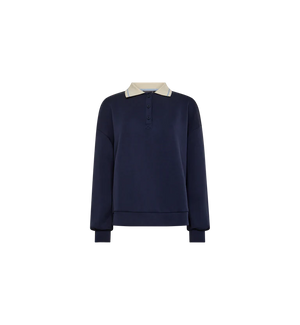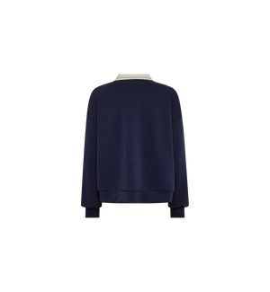 This Mos Mosh sweatshirt combines casual comfort with refined detailing, making it a standout everyday piece. Designed in a loose fit, it offers a relaxed silhouette while maintaining a polished edge. The contrast collar in a classic polo style adds a modern twist to the otherwise minimal design, creating a fresh and contemporary look. Crafted from a soft and stretchy blend of 48% LENZING™ ECOVERO™ viscose, 45% polyester, and 7% elastane, it provides both breathability and flexibility, ensuring all-day comfort. The elasticated cuffs complete the piece with a structured finish, balancing ease with sophistication. Perfect for versatile styling, it can be paired with skirts for a chic contrast or with jeans for an effortlessly cool, laid-back outfit.