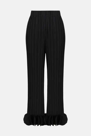 • Steal the show in these stunning wide-leg pants, crafted from lightweight, flowy georgette for effortless elegance and movement. Delicate pleating adds volume and flair, while a structured contour waistband flatters the waist for a polished silhouette. A bold circle appliqué at the leg openings adds a unique, eye-catching touch, making these pants a perfect choice for any special occasion.