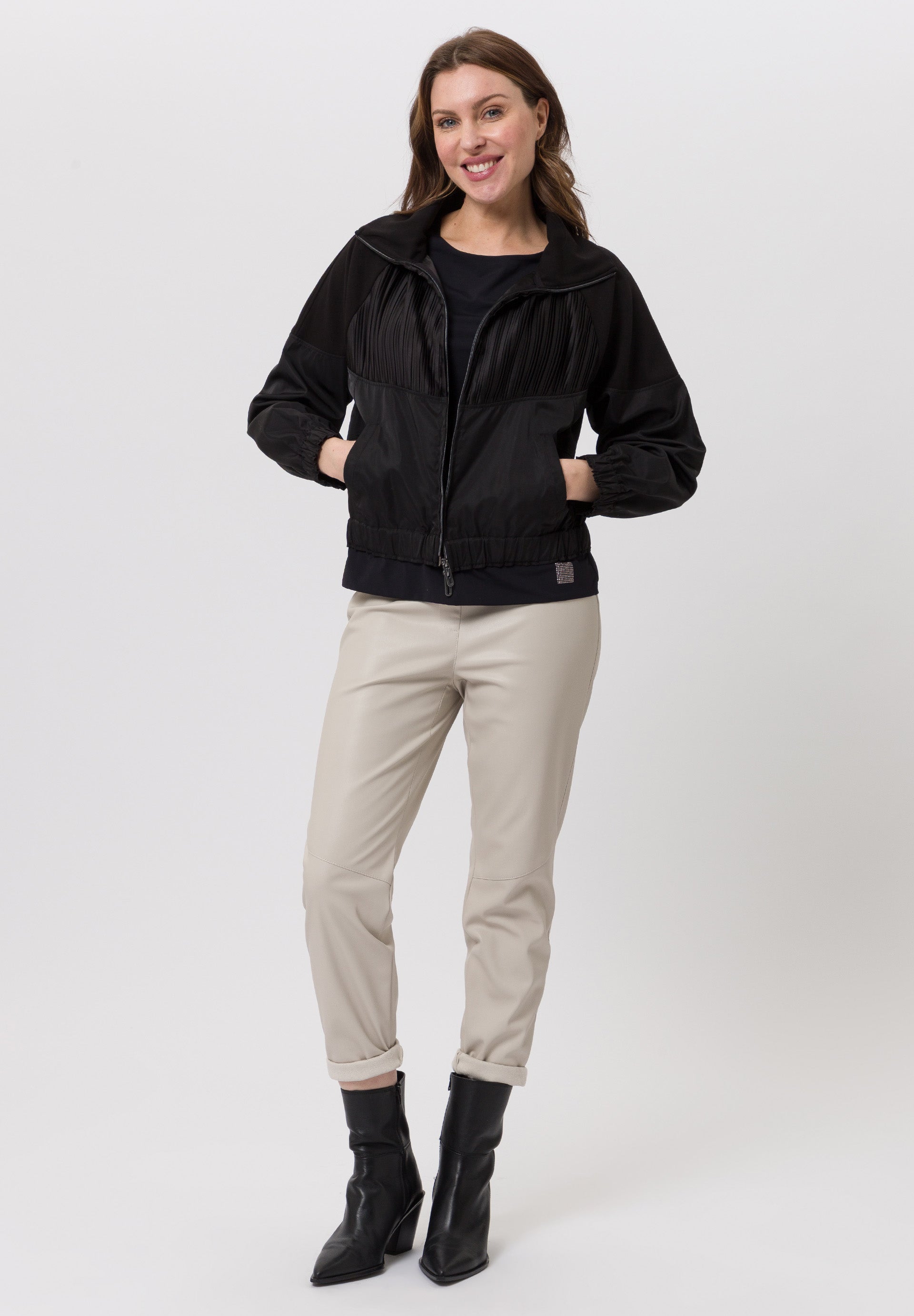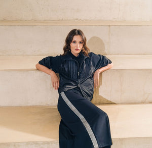 This jacket is a modern, sporty chic piece in a deep navy shade. It features a zip - up front with a sleek glossy finish on the fabric that gives it a slightly lustrous look. The design incudes short, loose fitting sleeves with a relaxed silhouette, allowing it to be styled casually yet elegantly. Subtle panel detailing through the bodice ads texture and dimension, enhancing its fashionable edge. The jackedt sblends comfort with contemporary stlemaking it versatile enough to dress up or down.