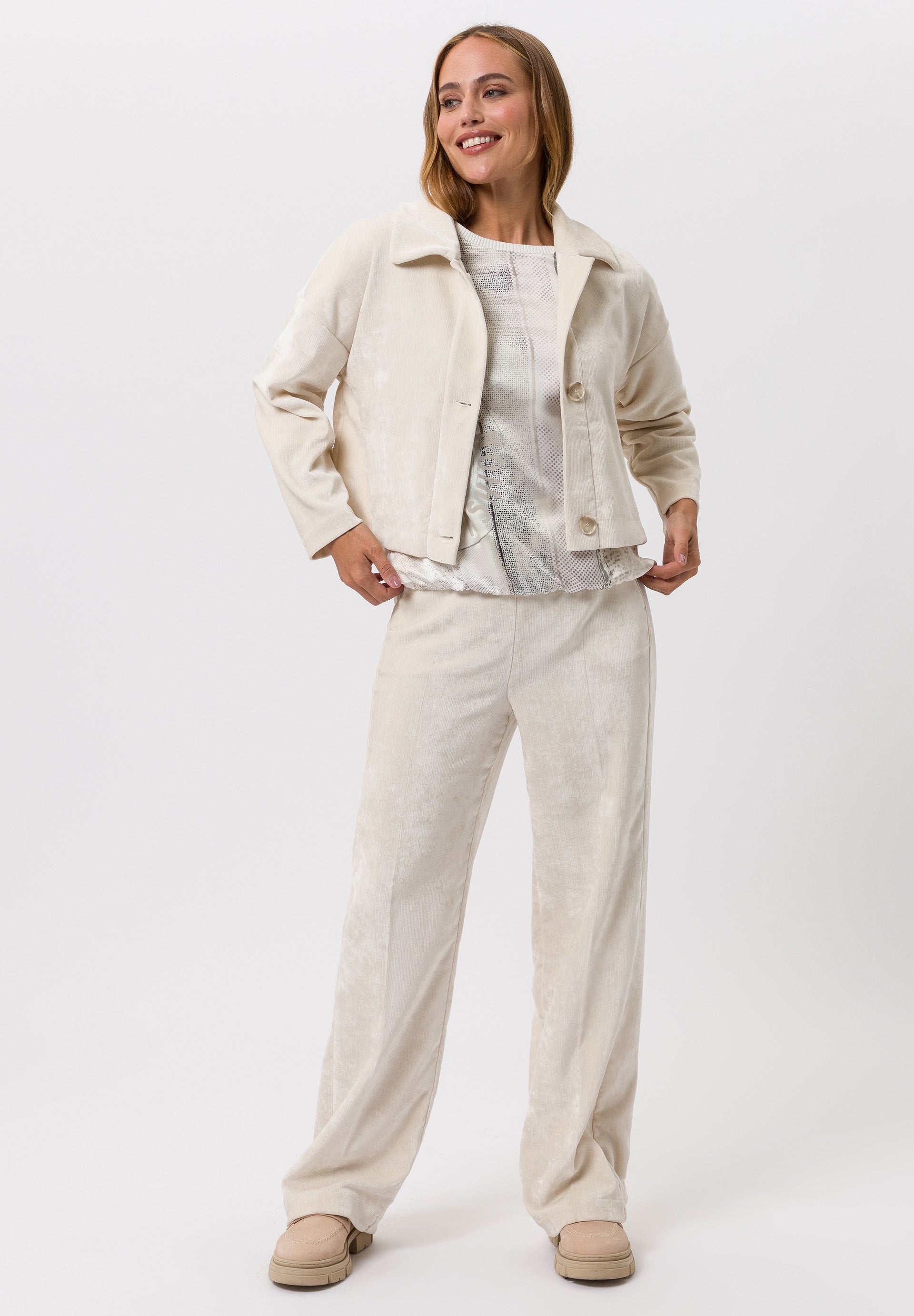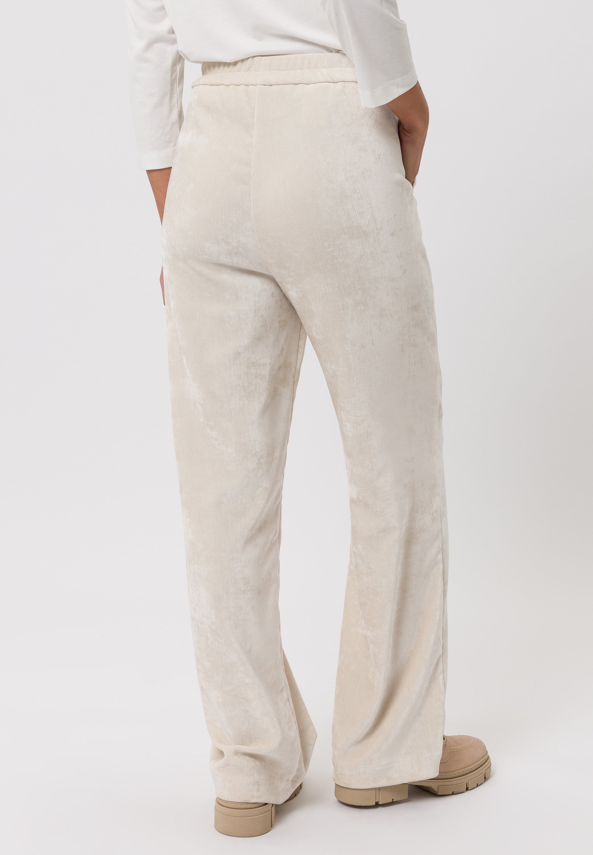 • These Tuzzi trousers are a stylish blend of comfort and elegance, crafted from a soft velour fabric with a subtle sheen that gives them a refined finish. Designed with a high-rise waist featuring a smooth front and elasticated back, they provide both structure and ease of wear. The straight-leg cut with front seam detailing creates a flattering, elongated silhouette, while the light beige tone makes them a versatile piece for any wardrobe. Perfect for pairing with the matching jacket for a coordinated look or styled separately with blouses, knitwear, or casual tops, these trousers transition effortlessly from day to evening, offering both sophistication and comfort.