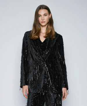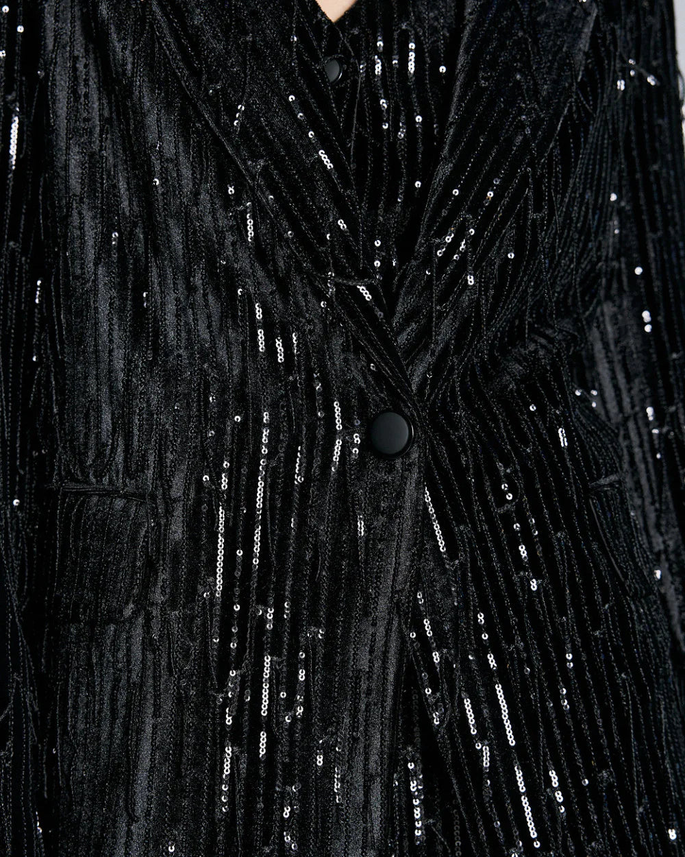 Velvet blazer with sequins and notch lapel collar. Features padded shoulders, front flap pockets and striking sequin fringes. Pair it with the matching pants from our collection for dazzling occasion looks.