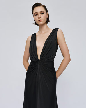 Maxi dress with tie and ruched details. It features a V-neckline and V-back. Choose it for standout occasion looks.