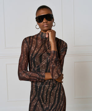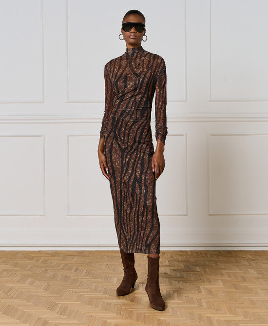 • This midi printed tulle dress is a modern statement piece, designed for effortlessly stylish looks. Crafted in semi-sheer tulle with an inner lining, it features a fitted silhouette enhanced by delicate ruching that adds texture and shape. The high neckline and long sleeves lend sophistication, while the printed design brings a contemporary edge. Made with recycled polyester and elastane, it offers both comfort and stretch for a flattering fit. Perfect for evening outings or chic day-to-night occasions, this dress combines elegance with modern flair.