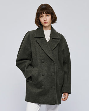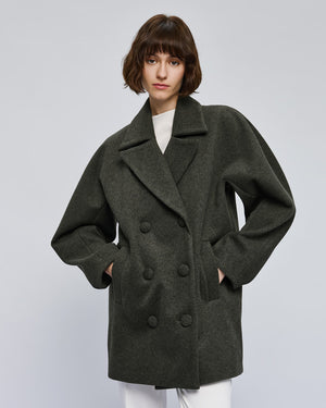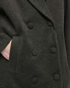 Short double-breasted coat with notched lapel collar and side pockets. Featuring front button closure and inner lining. An ideal choice for stylish and comfortable winter looks.