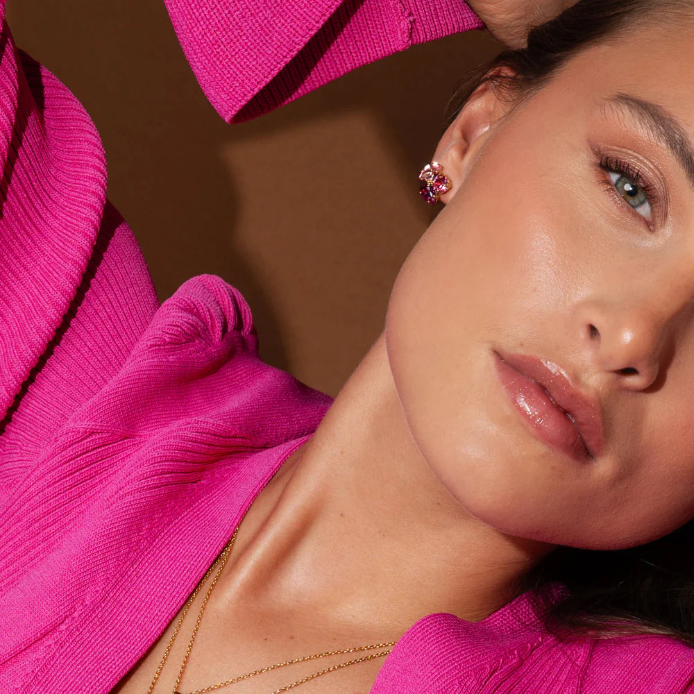 The Caroline Svedbom Ana Earrings in Dark Rose Combo are elegant and striking studs that showcase a bold mix of sparkling crystals in various cuts and shades of blue. Each earring features three distinct stones—a round, a marquise, and a teardrop—arranged in a chic clustered design that reflects light beautifully from every angle. The denim blue tones range from lighter sky blue to deep midnight, creating a rich contrast that adds depth and sophistication. Set in 18K gold plating, the warm golden base enhances the brilliance of the crystals while giving the earrings a luxurious finish. Handmade in Greece with nickel-free and hypoallergenic materials, these earrings embody Caroline Svedbom’s dedication to timeless design and quality craftsmanship. Perfect for both everyday wear and special occasions, the Ana Earrings in Denim Blue Combo bring a refined pop of color and glamour to any look.
