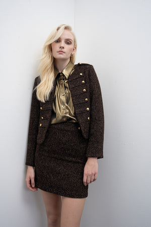 The skirt in the image is a mini skirt with a sleek, fitted silhouette. It has a dark textured fabric, likely a tweed or boucle material, giving it a subtle shimmer and depth. The cut is simple and straight, designed to hug the body without extra embellishments, making it versatile for both dressy and semi-formal looks.