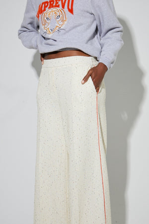 The standout detail is the ecru knit fabric sprinkled with multicolored micro-sequins, adding a subtle shimmer and a premium luminous texture without feeling too flashy. Finished with orange piping along the side seam, they create a chic contrast and visually lengthen the silhouette. With no fastening or zipper, they simply slip on for a clean, fluid look.