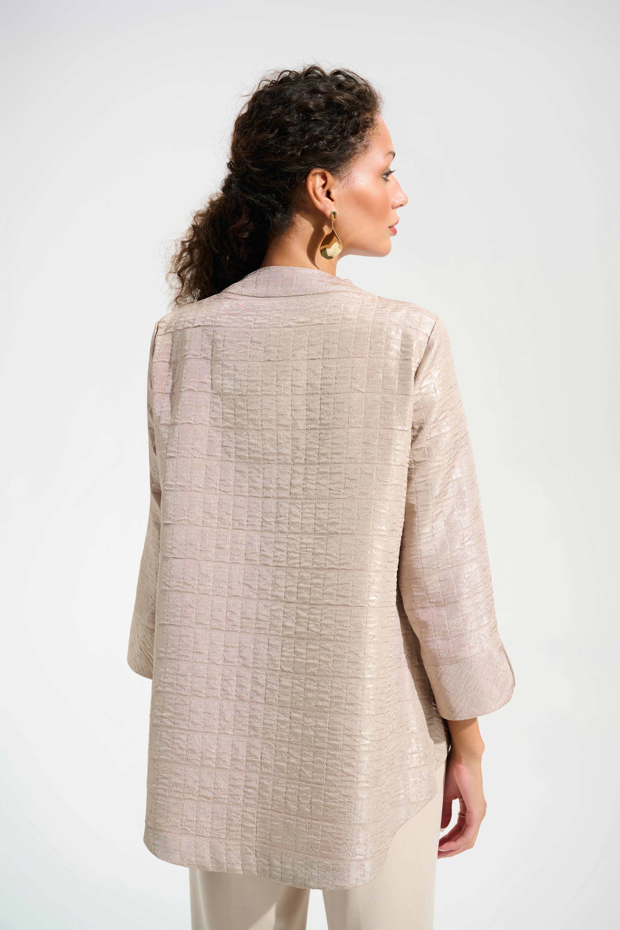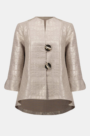 This structured trapeze jacket in foiled jacquard makes an impression with its sculptural volume and luminous sheen. Two statement buttons close the front, framed by a clean crewneck and cuffed sleeves. Part of the Signature collection.