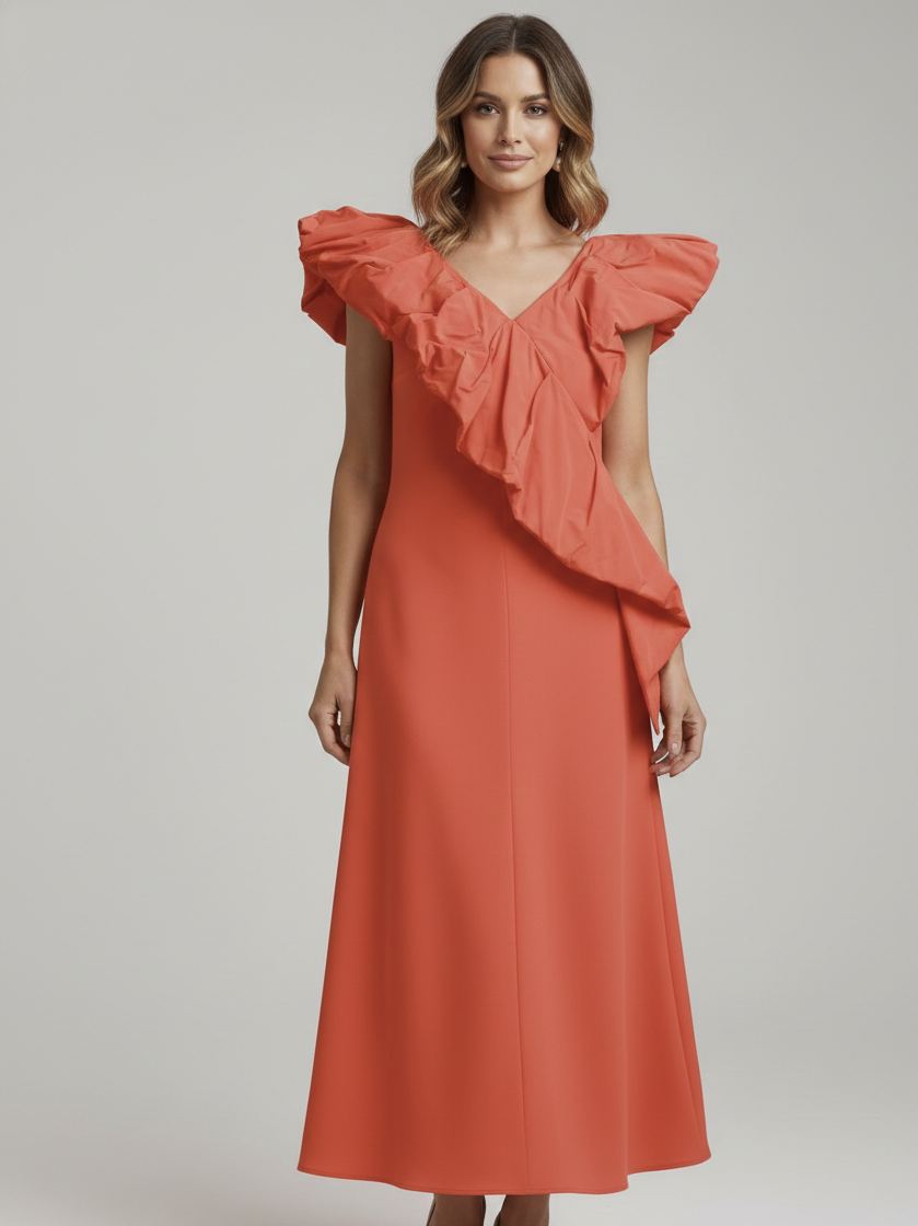 The dress features a soft V-neckline enhanced by a dramatic, sculptural ruffle that sweeps asymmetrically across the bodice and over the shoulders. The structured ruffle adds volume and architectural elegance, creating a bold yet refined statement.
