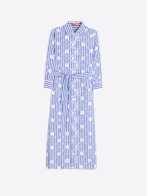 This effortlessly elegant Vilagallo shirt dress is crafted from 100% cotton, offering a crisp yet lightweight feel ideal for warm-weather wear. Designed with soft blue and white vertical stripes and delicate floral embroidery, it blends classic tailoring with a feminine, contemporary touch.