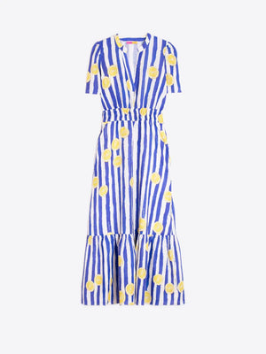Designed with bold blue-and-white vertical stripes, itโs accented with a playful lemon print scattered throughout for a bright pop of colour. The dress features a soft V-neckline and short sleeves, while the elasticated waist gently defines the silhouette for a flattering, easy fit. A tiered midi skirt adds movement and a breezy feel, perfect for warm-weather days.