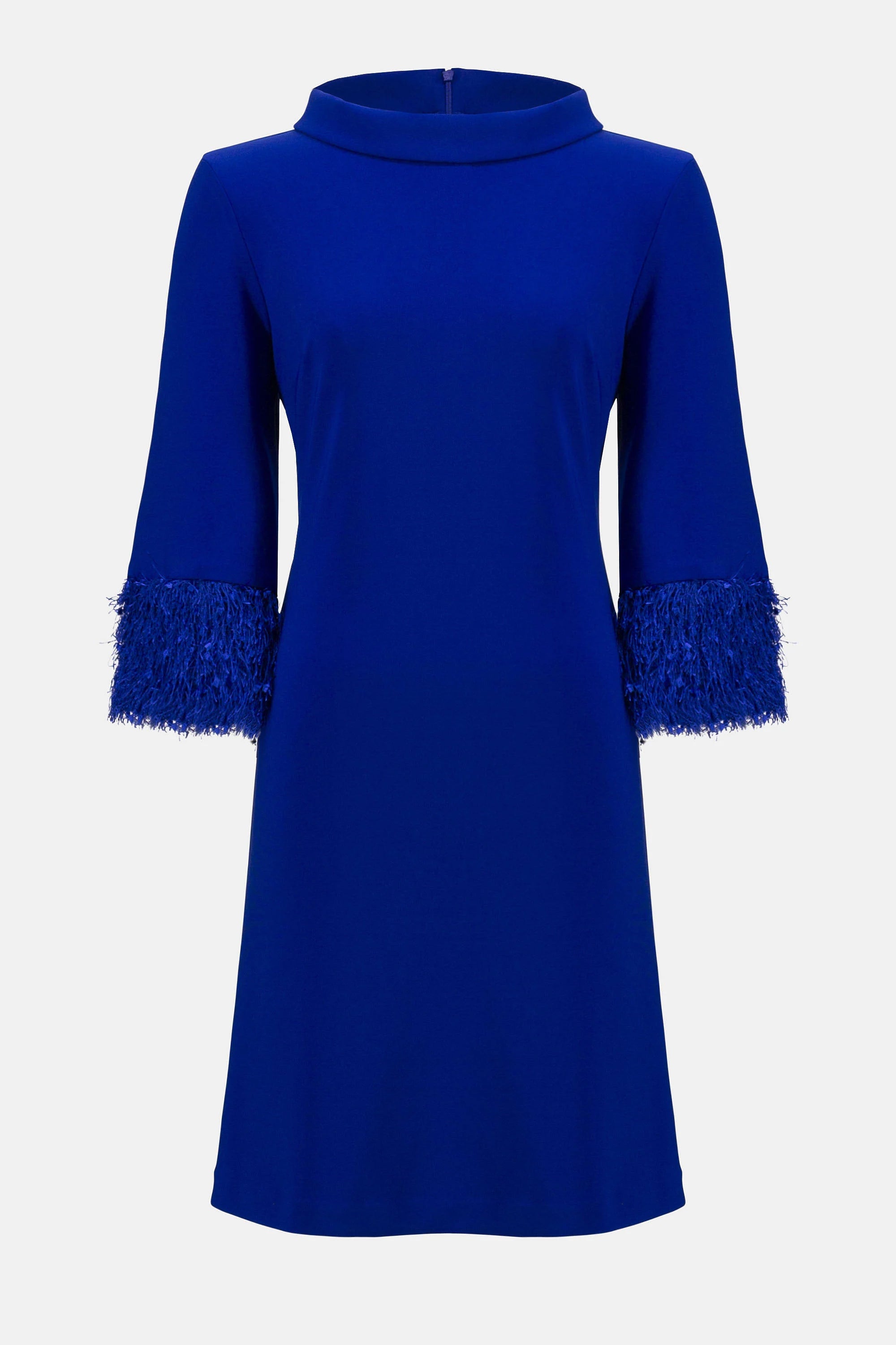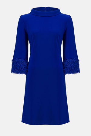 This bonded silky knit dress is the epitome of modern glamour. The garment features a chic cowl neck and an exquisite A-line silhouette. The three-quarter bell sleeves are adorned with a novelty fringe hem detail, adding a playful yet sophisticated touch to the design.