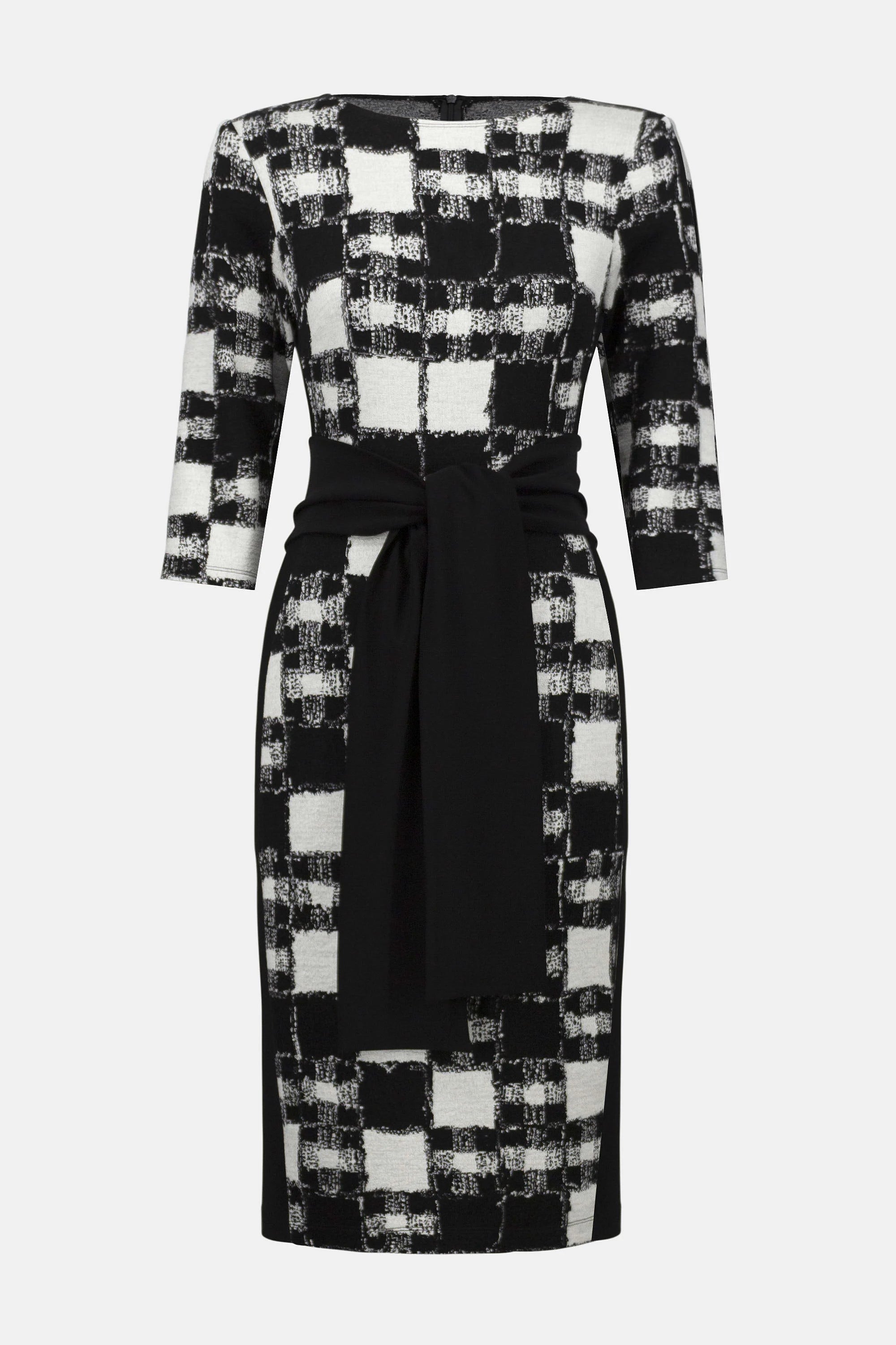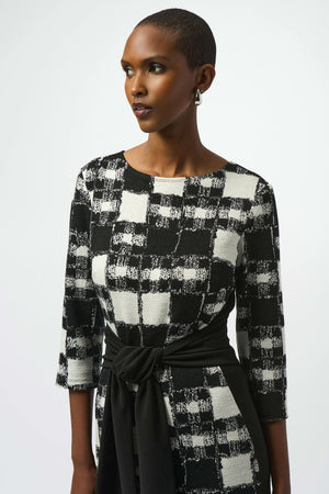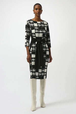 This exquisite sheath dress is designed to make a statement with its mesmerizing plaid print, flattering boat neckline, and waist-defining contrasting front sash. Crafted from a luxurious jacquard sweater knit, it features silky knit side panels that offer both ease of movement and added style. A back zipper closure and a slit at the hemline complete this standout piece with a polished, sophisticated finish.