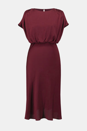 Crafted from recycled hammered satin, this dress showcases a sleek scoop neckline and a blouson bodice that drapes beautifully. Short dolman sleeves and an A-line design create a chic flowing silhouette, while a delicate button at the back adds a refined finish.