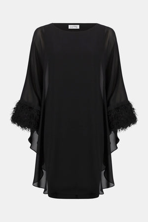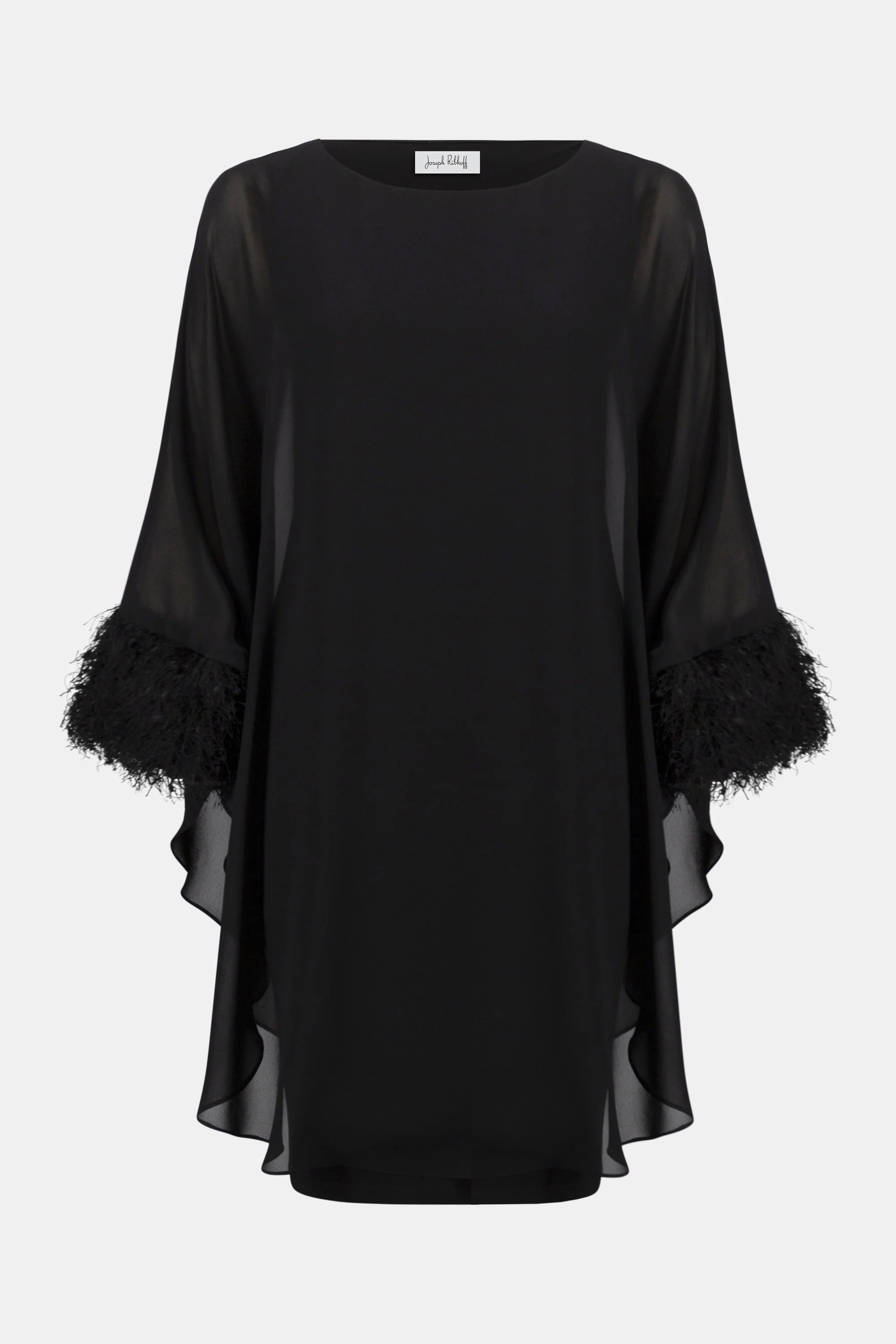 With a sheath silhouette and a flowing chiffon overlay, this silky knit dress is designed to make a lasting impression. Fringed cuffs add a touch of drama, while the elegant boat neckline and long dolman sleeves enhance its refined appeal.