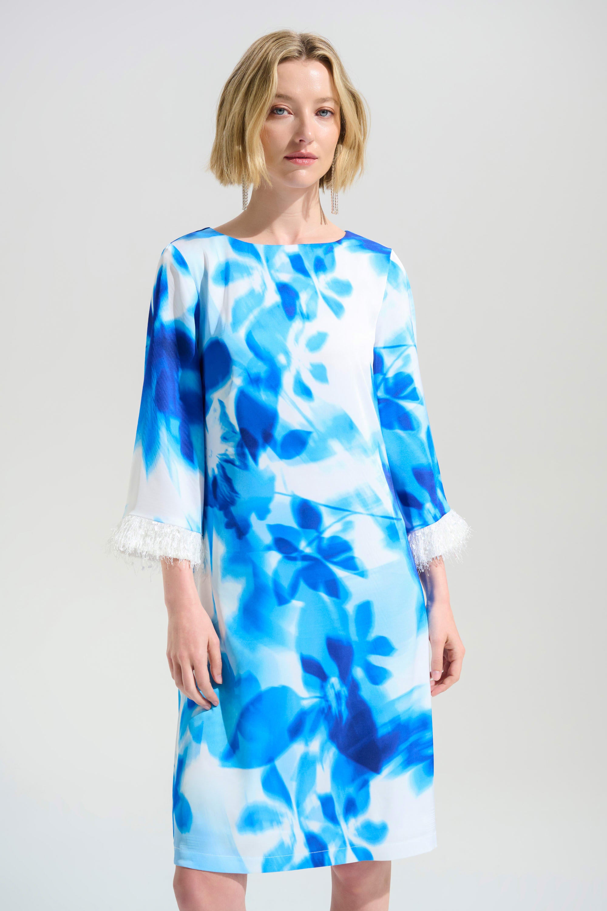 A graceful shift silhouette in recycled satin, this floral print dress features a boat neckline and novelty trim accents at the sleeves. Finished with a back keyhole for an elegant touch. Part of the Signature collection.