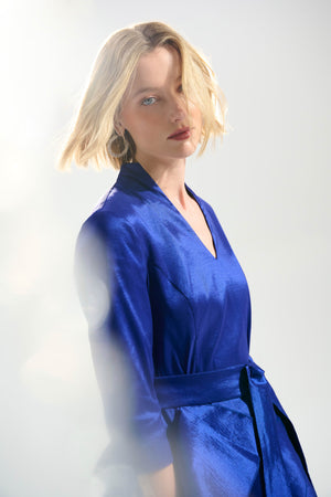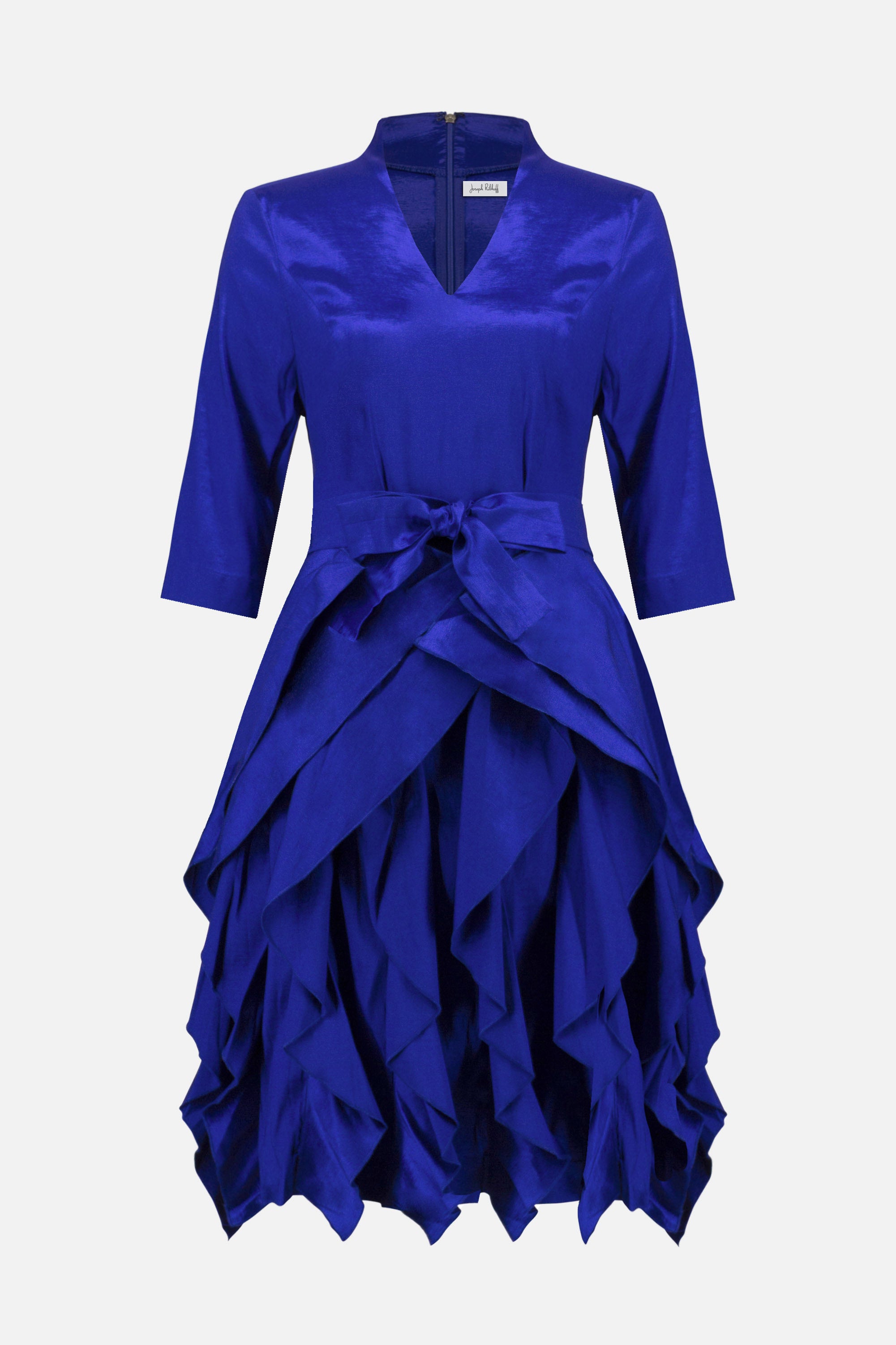 A crisp stretch taffeta dress that balances structure and softness with a ruffled tiered skirt and tailored V-neckline. The sash belt defines the waist, while the back zip keeps the finish clean. Part of the Signature collection.