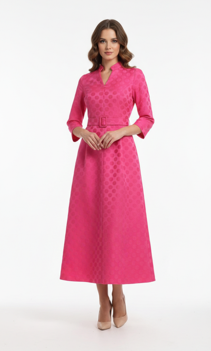 A matching fabric belt with a rectangular buckle cinches the waist, emphasizing shape and creating a tailored, polished appearance. The overall style feels timeless and chic — suitable for formal daytime events, weddings, or elegant social occasions.