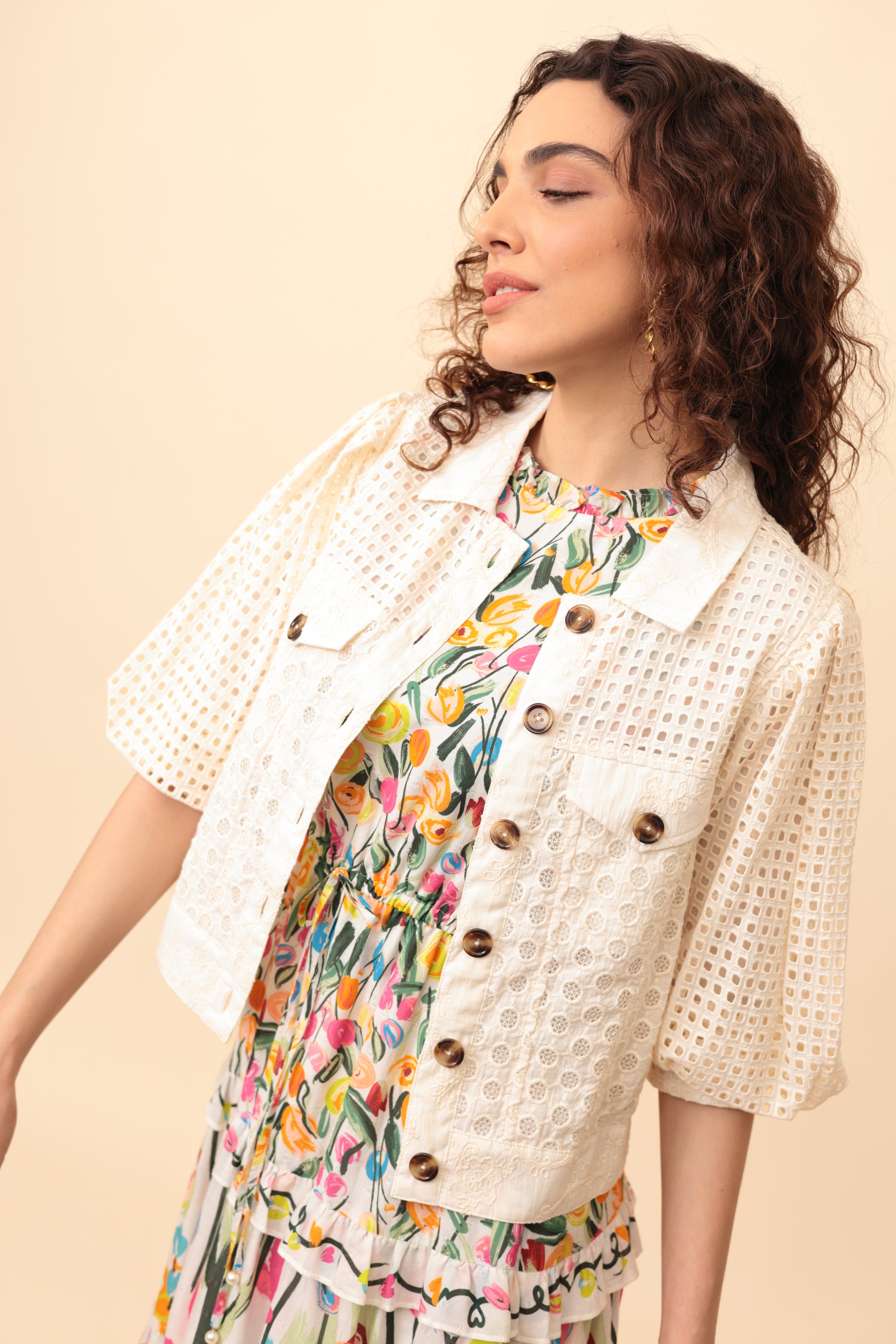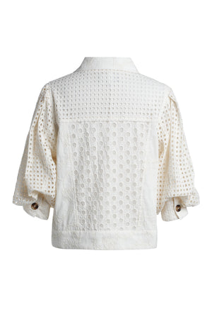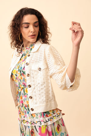 The Judy Jacket by Emily Lovelock is a feminine and contemporary short jacket that blends classic tailoring with delicate texture and modern detailing. Designed in a soft ivory tone, the jacket features a structured collared neckline and a full button-down front finished with large tortoiseshell-style buttons that add contrast and sophistication. The design incorporates intricate embroidered and cutwork fabrics, including a square eyelet pattern across the shoulders and sleeves and circular embroidered motifs through the body, creating rich texture and dimension. It also features two front flap pockets for a subtle utility touch. The three-quarter length sleeves have a slightly voluminous shape and rolled cuffs, giving the silhouette a relaxed yet polished feel. With its cropped, slightly boxy fit, the Judy jacket layers beautifully over dresses or lightweight tops, embodying Emily Lovelock’s signature aesthetic of elegant refinement, soft structure, and playful sophistication.