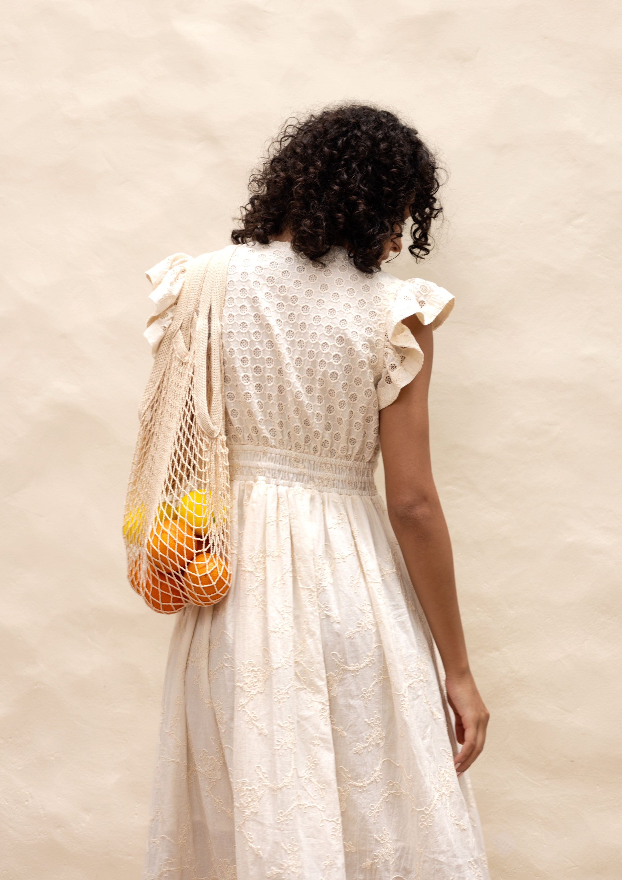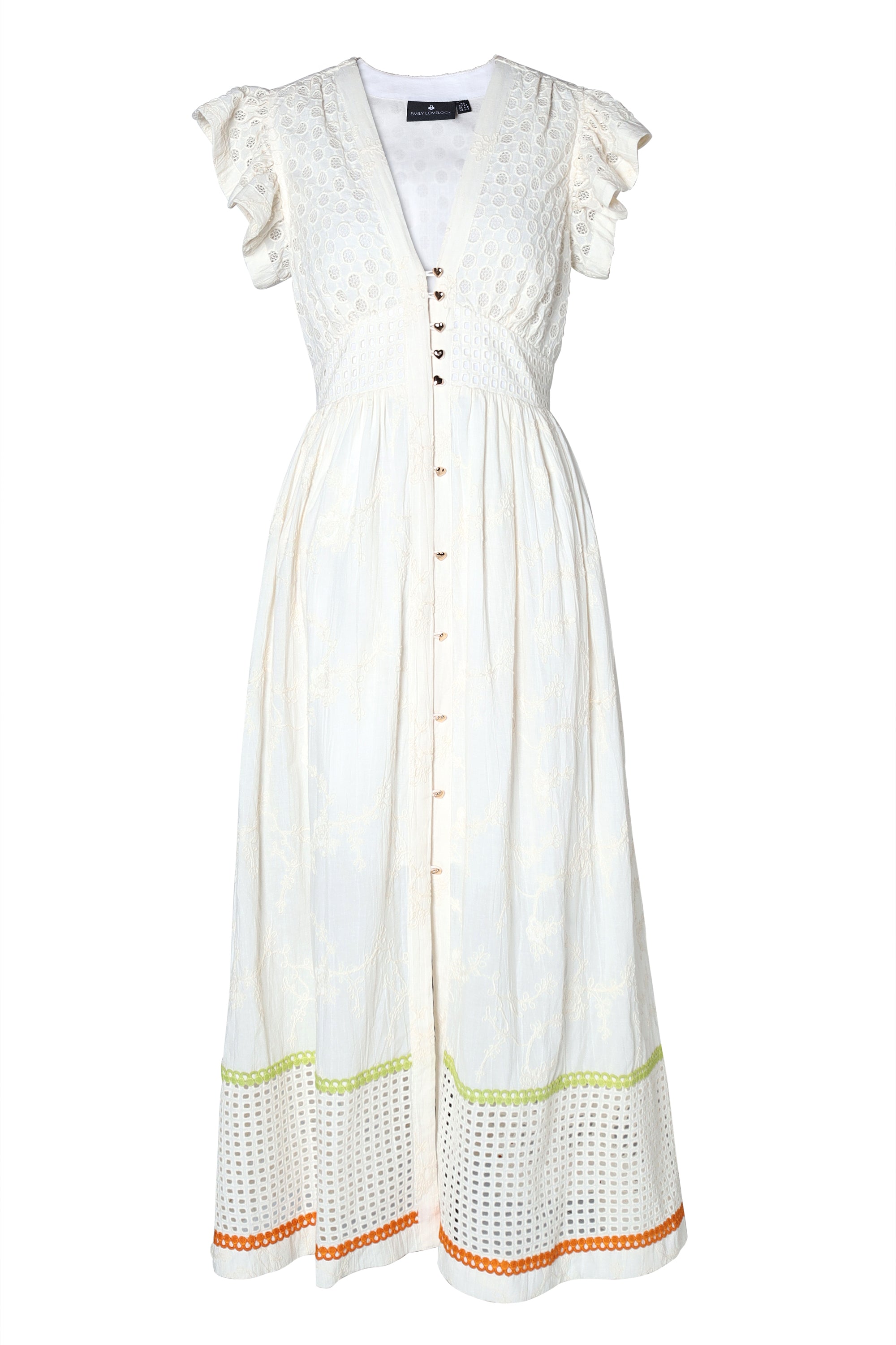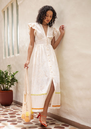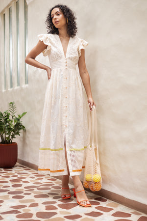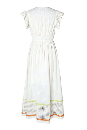 The Emily Lovelock Madeline Dress in ivory is a romantic and feminine midi dress crafted from lightweight embroidered fabric that reflects the brand’s signature blend of elegant refinement and playful sophistication. The dress features a flattering deep V-neckline and delicate flutter sleeves that create a soft, airy silhouette. The bodice is fitted with an embroidered panel and structured waistband, while the front is finished with gold-tone heart-shaped buttons running down the center for a charming detail. The skirt falls into a flowing A-line midi length, subtly textured with tonal floral embroidery and a front slit that adds movement and ease. At the hem, cutwork lace panels are highlighted with lime green and orange trim, giving the dress a fresh, playful contrast. Elegant yet relaxed, the Madeline dress combines intricate craftsmanship with effortless summer style, making it ideal for warm-weather occasions, vacations, or daytime events.