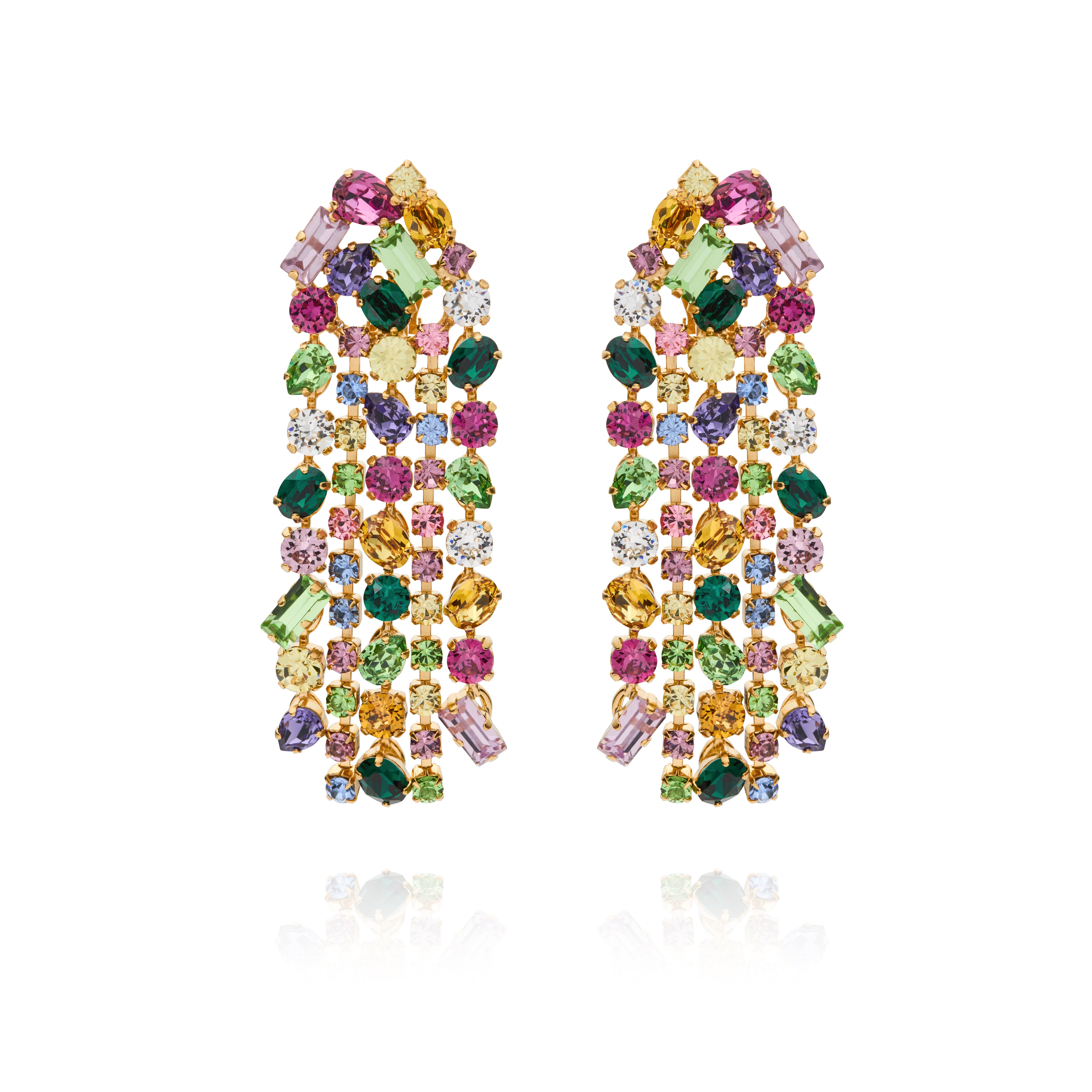 The Noelle Statement Earrings in Festive Combo are a dazzling showcase of vibrant color and bold design, perfect for making an unforgettable impression. Handcrafted with meticulous detail, these earrings feature cascading rows of multi-shaped Swarovski crystals in a striking mix of hues—emerald green, fuchsia, lilac, sapphire blue, golden yellow, and crystal clear—each sparkling beautifully as they catch the light. Set in 18K gold-plated metal, the long, fluid design creates dramatic movement, making them the ultimate statement piece for special occasions, glamorous nights out, or whenever you want to elevate your look.