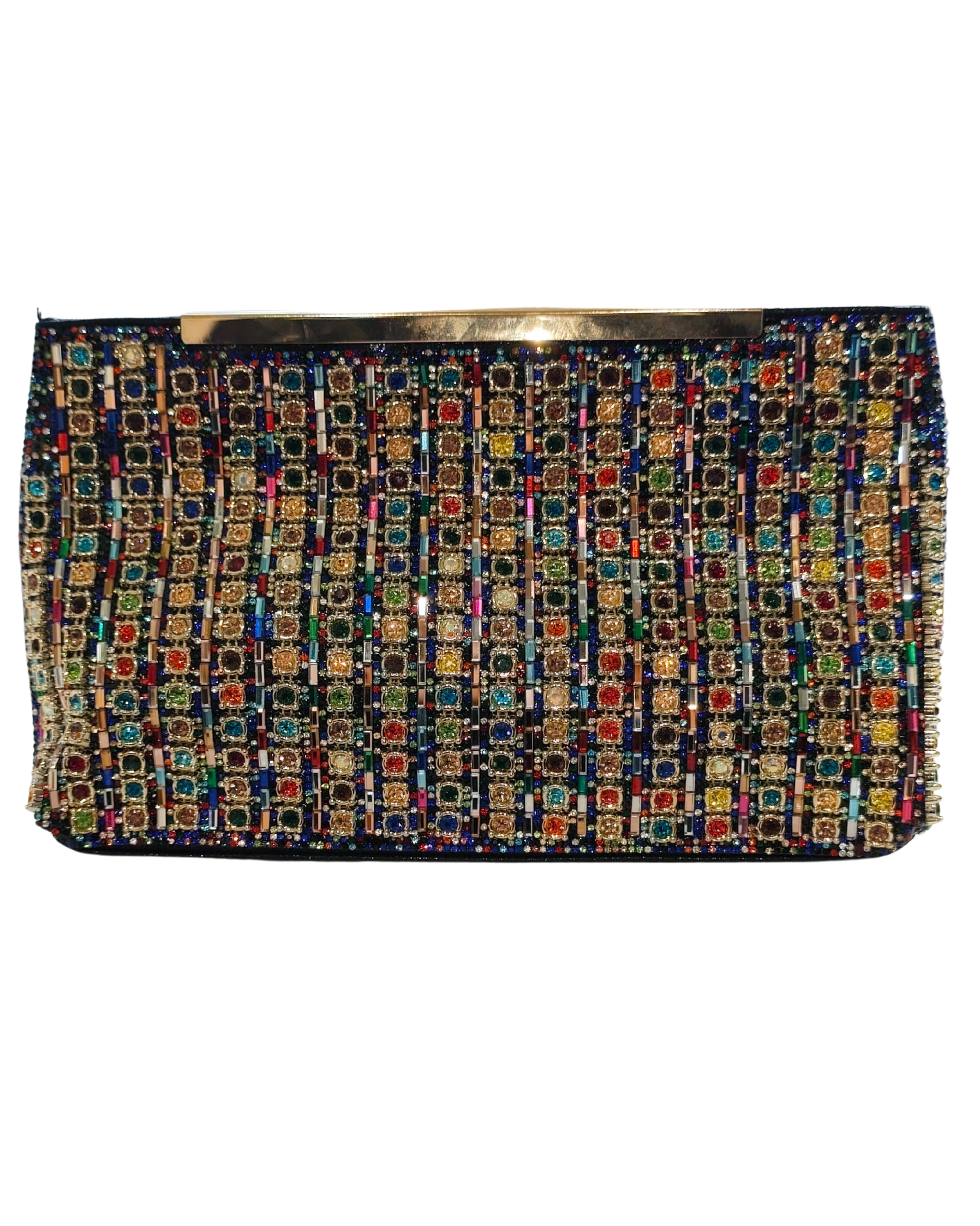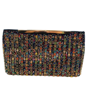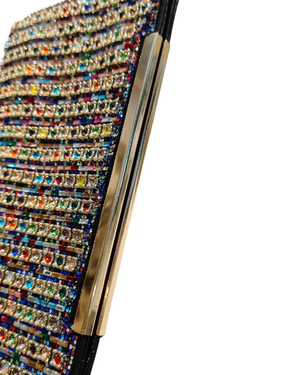 • This glamorous rectangular clutch is fully embellished with a dense, structured pattern of multicolored crystals, creating a dazzling grid-like mosaic. The surface is covered in alternating vertical rows of small round rhinestones and faceted baguette-style gems in brilliant shades of red, blue, green, gold, turquoise, and clear, giving the bag a vibrant and luxurious appearance.