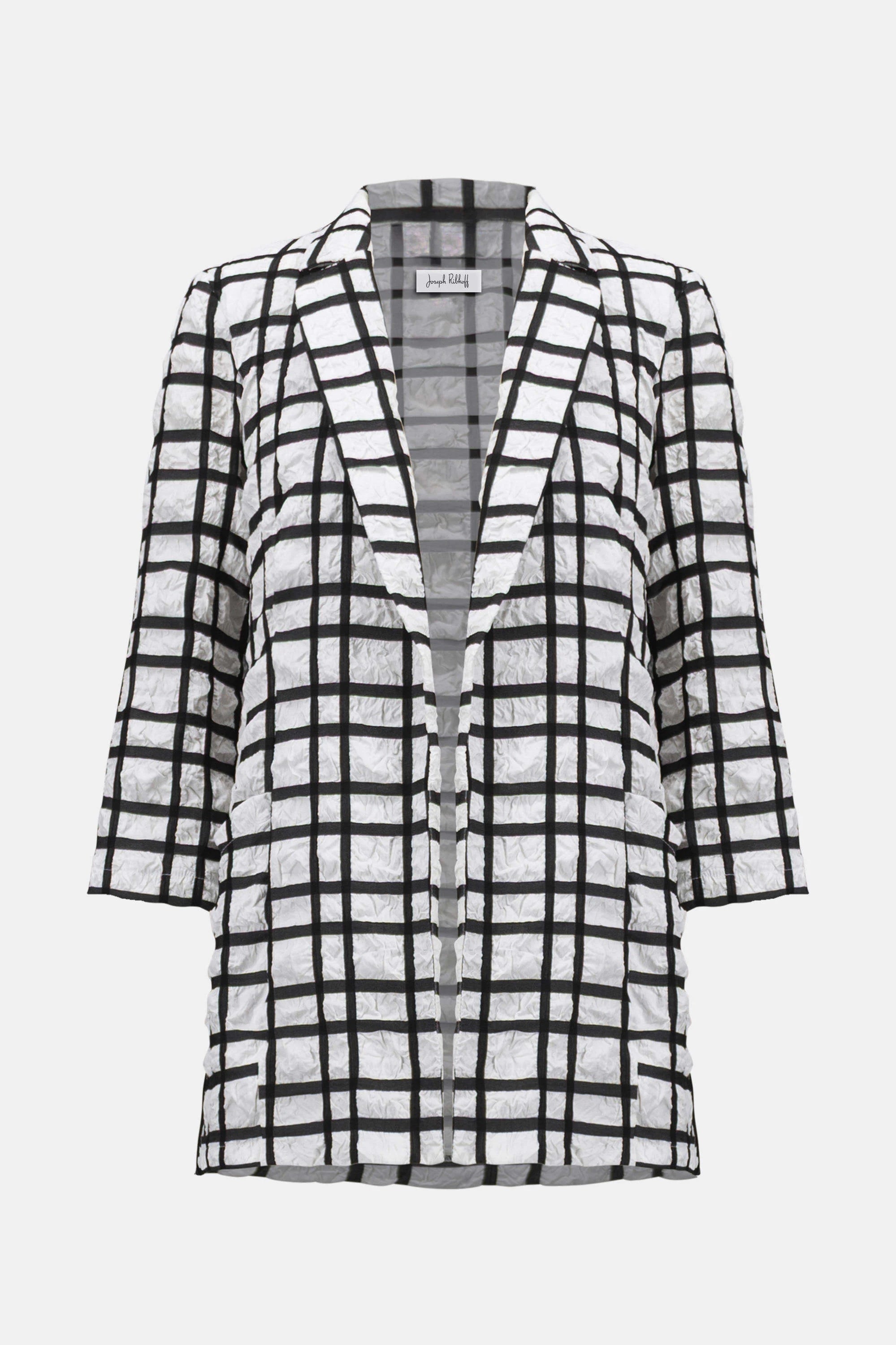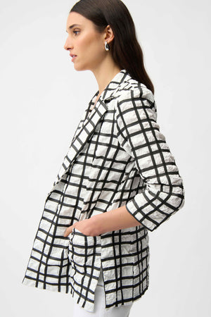 This plaid jacquard blazer features a boxy fit with a notched collar and three-quarter straight sleeves. Side slits and bucket pockets offer ease and function in an unlined finish.