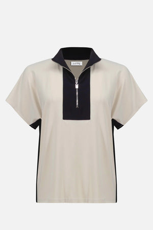 This silky knit top brings a sporty edge to clean lines, featuring a zipped stand collar and short dolman sleeves. The contrast collar and placket deliver a bold finish to the color block design.