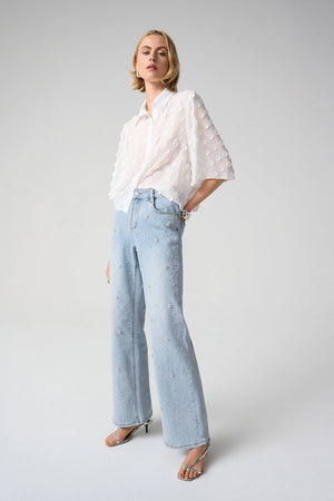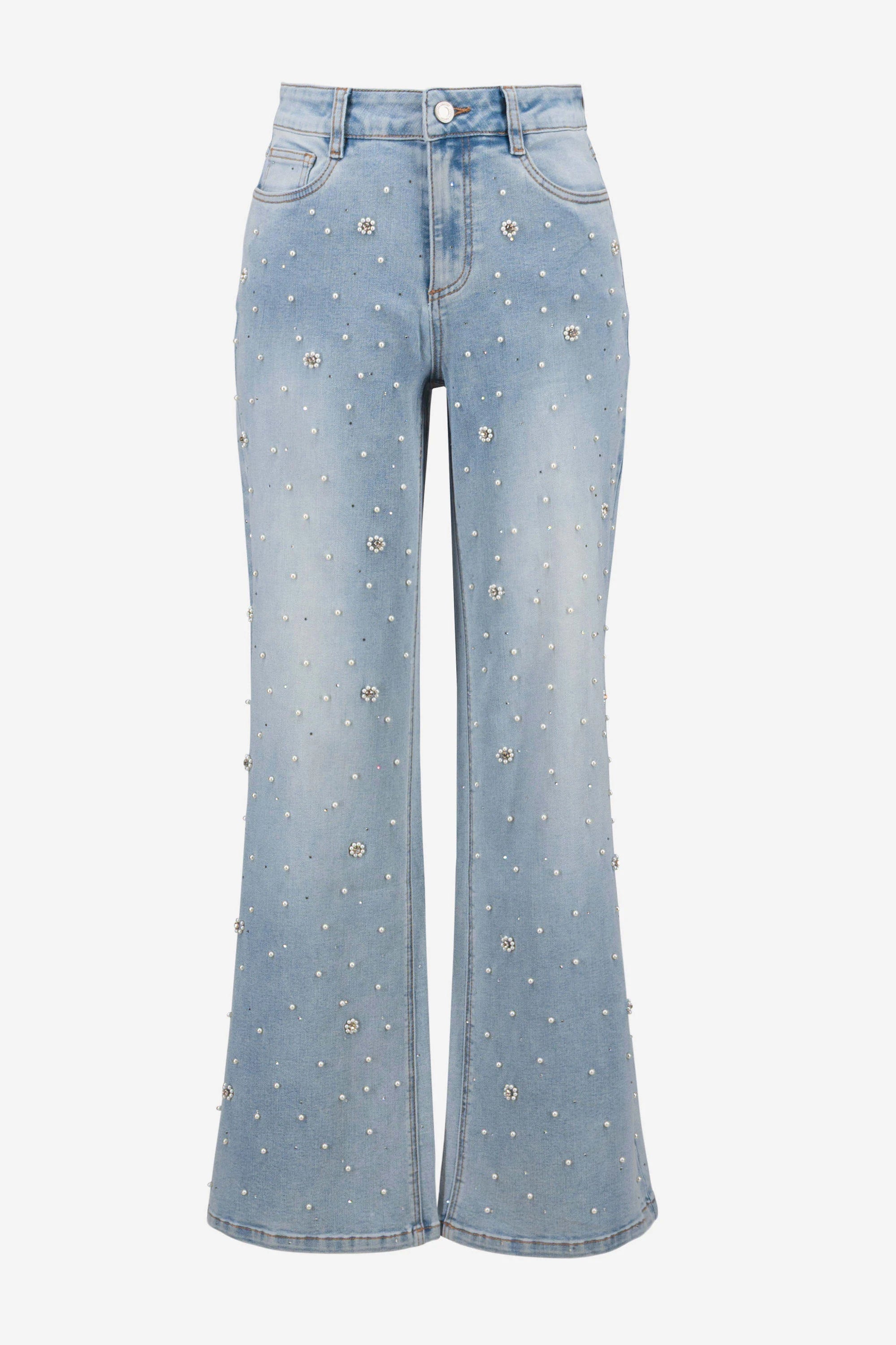 Add a romantic twist to your denim rotation with these eco-friendly Repreve® denim wide leg pants, featuring scattered pearls, rhinestone detailing, and delicate floral accents.