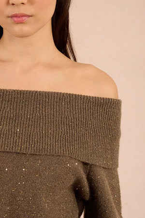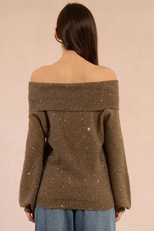 This Molly Bracken sweater is a glamorous yet cozy piece, perfect for elevating a casual look. It is knitted and delicately studded with sequins, giving it a subtle sparkle that catches the light beautifully. The design features a wide turtleneck that falls elegantly over the shoulders, creating an off-shoulder effect that adds a feminine and modern touch. The long balloon sleeves bring volume and softness, while the tightened cuffs provide structure and balance. Cut in a straight fit, the sweater drapes comfortably over the body, making it versatile for different occasions. With a length of 56 cm from the shoulder in size S, it offers a flattering silhouette that pairs well with skirts, trousers, or even layered over dresses for a chic, effortless style.