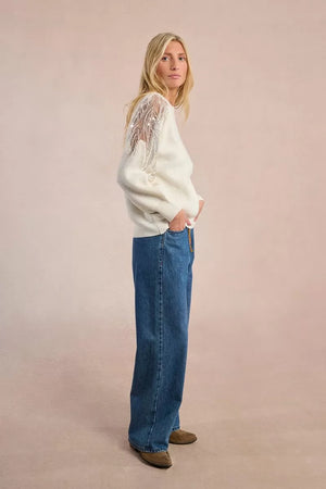 • Sweatshirt-style knit sweater -Long sleeves, balloon -Tightened cuffs -Openwork lace shoulders studded with rhinestones -Scoop neckline -Straight and wide fit -Length from the shoulder 57cm for a size S