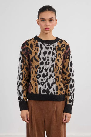 Knitted sweater -Long sleeves -Striped mesh with leopard pattern -Long sleeves -Straight fit -Round neckline close to the neck -Neckline, cuffs and hem finish tightened -Length from the shoulder 58cm for a size S.