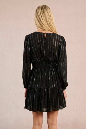 • Step into delicate elegance with this ruffle mini dress featuring a dreamy, semi-transparent fabric with iridescent stripes that catch the light beautifully. The dress is designed with long puffed sleeves that gather into tightened cuffs, complementing the round neckline for a soft, romantic silhouette.