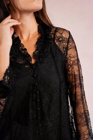 The Molly Bracken lace voile shirt is a delicate and romantic piece that combines sheer elegance with refined details. Crafted in transparent lace voile, it comes lined with a removable camisole for versatile styling and added comfort. The design features long balloon sleeves finished with tightened cuffs, adding graceful volume to the silhouette. A flattering V-neckline is highlighted by a scalloped lace band and a ribbon tie that can be fastened at the neckline for a feminine touch. The front is detailed with a covered button closure, while scalloped edges finish the hemline for a refined look. Measuring 63 cm from the shoulder for a size S, this blouse is made from a blend of 95% polyester and 5% elastane, with a lining of the same composition, offering both softness and subtle stretch for ease of wear.