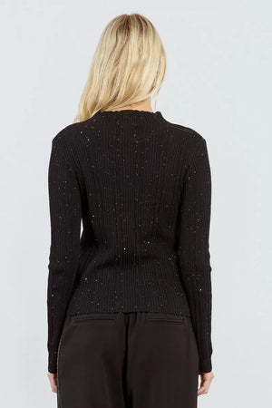 Thin ribbed knit sweater studded with rhinestones -Long sleeves -Semi-stand-up collar -Slim fit -Raw edge finish -Length from the shoulder 57cm for a size S. 54% Polyester 20% Acrylic 20% Polyamide 6% Wool