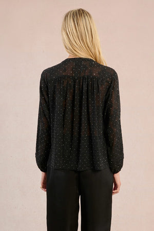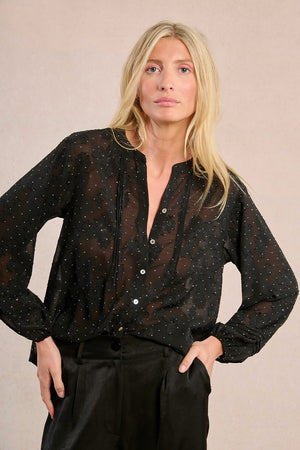 Flowing shirt in semi-transparent voile -Lace and polka dot print -Long balloon sleeves, tightened cuffs -Tunisian collar highlighted by a V-neckline -Pleats on the front -Pearlescent button closure on the middle front -Straight fit -Length from the shoulder 60cm for a size S