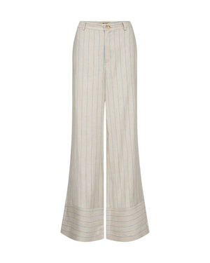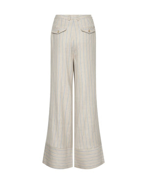 • The Mos Mosh Medina Miriam Trouser is a chic and breezy addition to any summer wardrobe. Crafted in a light beige fabric with subtle blue pinstripes, these trousers exude relaxed elegance with a tailored twist.