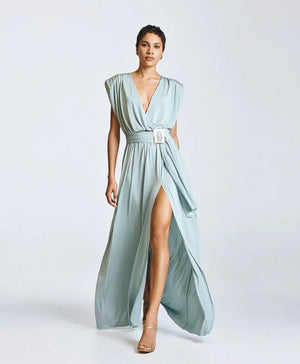 This maxi sleeveless wrap dress features an elegant, flowing silhouette designed for both style and comfort. Made from soft elastic fabric with 95% polyester and 5% spandex, it offers a regular fit that drapes beautifully on the body. The dress showcases a flattering wrap-style V-neckline and padded shoulders that add structure and a modern touch to the sleeveless design. An elasticated waist enhances comfort while defining the figure, and the detachable belt with a metallic buckle accentuates the waist for a refined finish. A side slit adds movement and a subtle hint of allure, making this maxi dress a sophisticated choice for both daytime events and evening occasions.