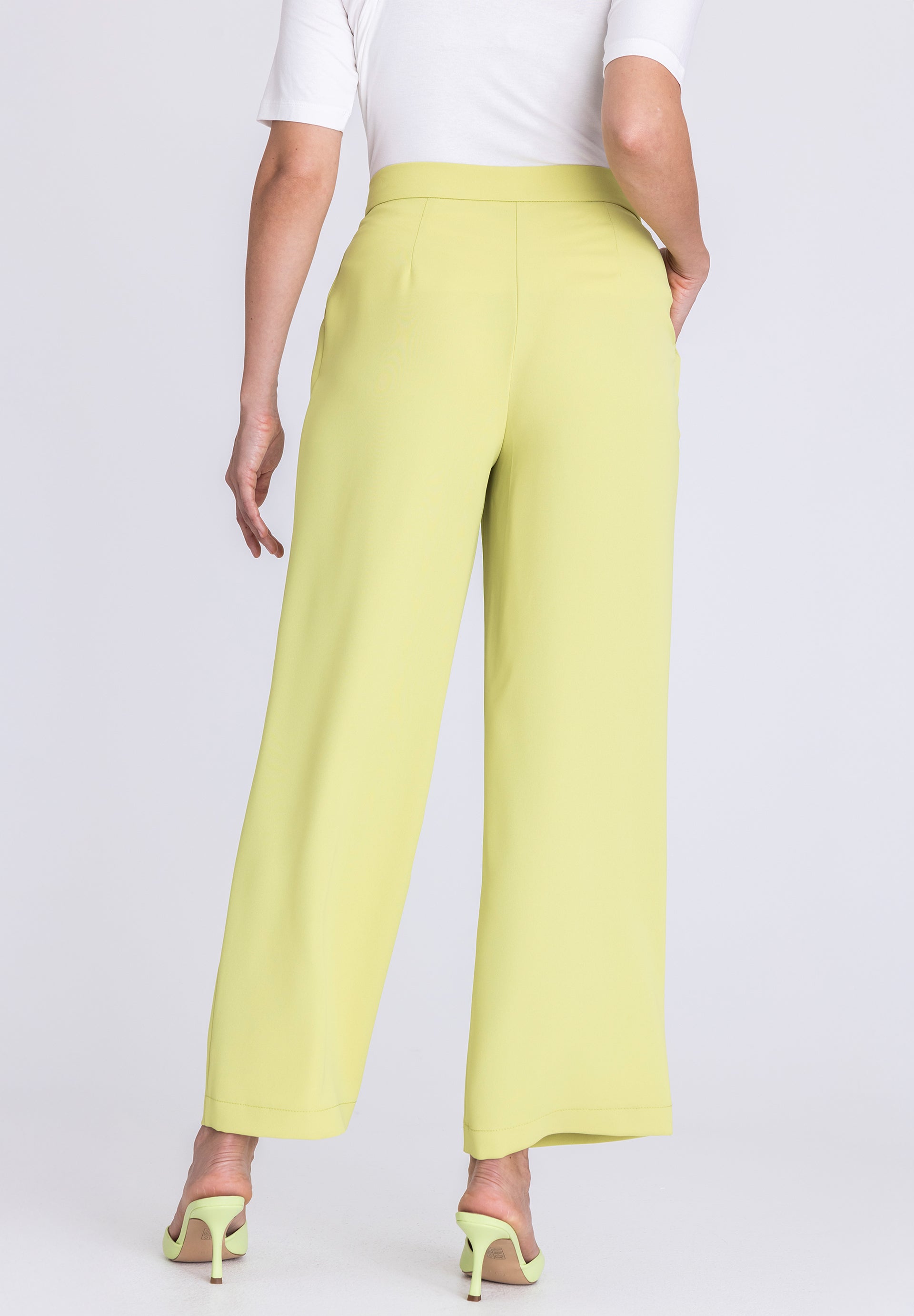 • These Tuzzi lime trousers are a fresh and modern statement piece, crafted in a soft, fluid fabric that drapes beautifully over the silhouette. Designed with a flattering high-rise waistband, they feature subtle front pleats that add structure while maintaining a relaxed, elegant feel. The wide-leg cut creates a long, flowing line, offering both comfort and sophistication. Side pockets enhance practicality without disrupting the clean finish, while the smooth back keeps the look streamlined. The vibrant lime hue adds a contemporary pop of colour, making these trousers perfect for pairing with coordinating tops or neutral pieces for a polished, fashion-forward outfit.