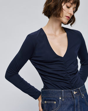 Refresh your wardrobe with this Navy Top, crafted from a soft and stretchy blend for all-day comfort. Designed with a flattering V-neckline and elegant long sleeves, it features front gathered details that add a touch of sophistication and enhance the silhouette. Perfect for creating stylish casual outfits, this versatile piece transitions effortlessly from day to evening.