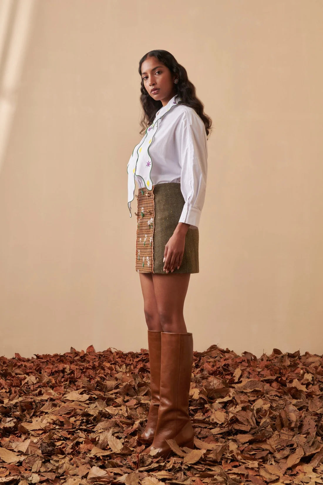 • The Celia B Affection Top reimagines the timeless white shirt with the brand’s signature playful artistry. Made from crisp cotton, it stands out with a dramatic scalloped bib collar that extends into a long front panel, richly decorated with embroidered details in yellow, purple, and green. Its tailored silhouette, button-down front, and three-quarter sleeves provide a structured balance to the whimsical embellishment. A versatile piece that transitions easily from day to night, this top is perfect for elevating everyday looks or pairing with bold skirts and trousers to create a statement ensemble.