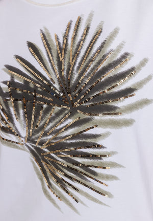 The standout detail is the front palm-leaf motif, printed in soft neutral tones and enhanced with shimmering sequins, adding texture and a touch of understated glamour. This decorative element gives the otherwise simple T-shirt a more elevated, fashion-forward look.
