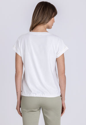 Additional design details include a slightly elasticated hem with a side drawstring, allowing you to adjust the shape for a more fitted or blouson effect. The ecru/ivory base colour keeps the look fresh and versatile, pairing effortlessly with coordinating trousers or casual separates.