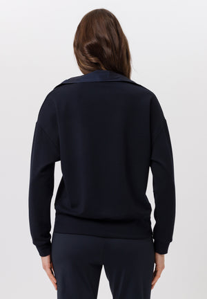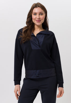 This versatile Tuzzi blouse offers a sporty yet refined aesthetic, perfect for a modern casual wardrobe. It features a unique combination of fabrics for both comfort and style. The main body is crafted from a soft blend of 55% modal, 39% polyester, and 6% elastane, ensuring a comfortable stretch and a luxurious feel. Contrasting details, including the polo-style collar and a hemline panel, are made from 100% polyester, giving the piece a subtle textural and visual interest. The deep navy color and relaxed fit make it an effortless choice for everyday elegance.