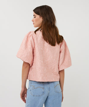 This EsQualo wide blouse is a statement piece with an elegant, feminine flair. Crafted from richly textured jacquard fabric, it features a subtle woven pattern that adds depth and sophistication to the soft blush tone.