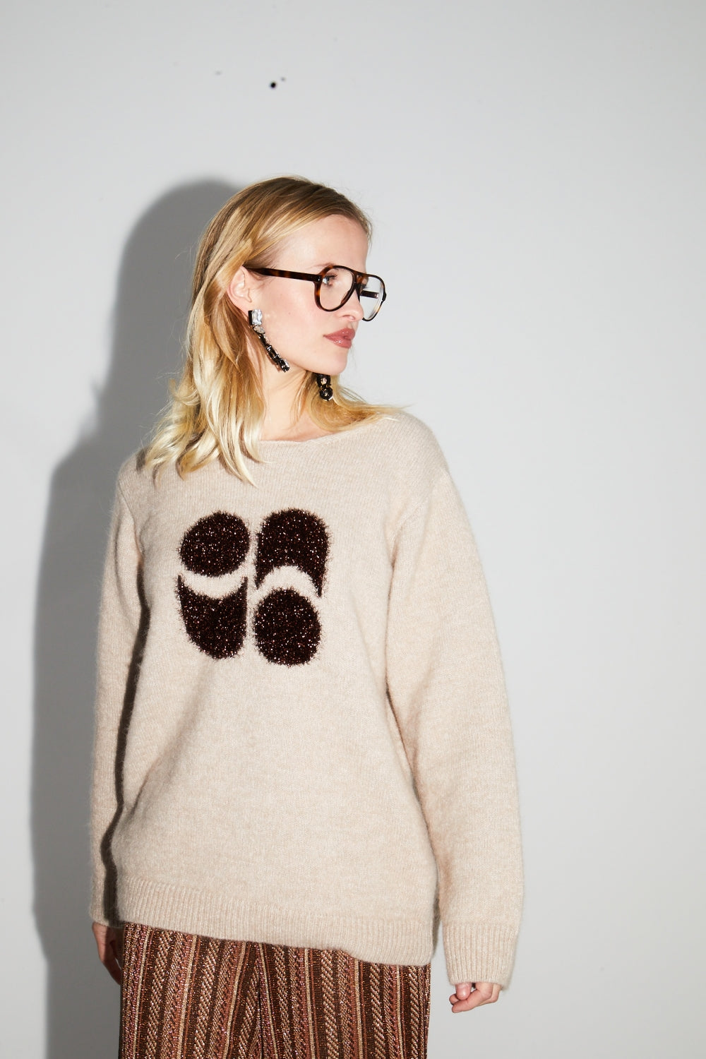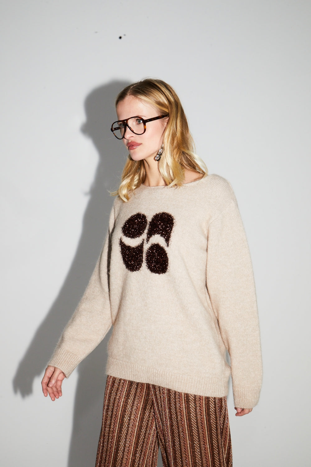 The Imprevu wide-leg pants feature a fluid, straight cut with generous width, designed for effortless elegance and all-day comfort. The elasticated waistband adapts naturally to movement without constriction, making them easy to wear. Knitted in Italy from a soft, supple stretch yarn, the pants offer both flexibility and a refined drape. Their vertical striped design alternates between fine openwork and solid lines, elongating the silhouette while introducing a graphic, geometric rhythm. The color palette combines warm tones of cognac, black, and bronze, delicately highlighted with a copper lurex thread for a subtle sparkle. With no fastenings, they slip on with ease and fall to a sophisticated length that works perfectly with sneakers, loafers, or heels. Exceptionally versatile, they pair just as well with a cozy sweater for a casual look, a blazer for elegance, or a shimmering knit for festive occasions. Made in Italy with meticulous attention to detail. Composition: 88% viscose, 6% polyester, 6% polyamide — a soft, fluid knit with gentle stretch and lasting resistance, ensuring freedom of movement without losing shape.
