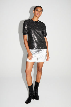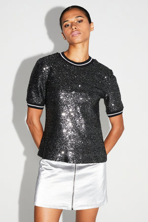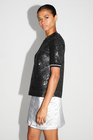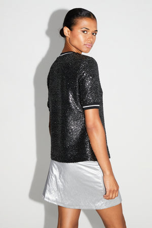 • The Imprevu sequin blouse features a straight, slightly loose cut that offers ease and effortless elegance. Designed with short sleeves and a round neckline, it revisits the classic t-shirt spirit with a touch of refinement. The neckline and cuffs are framed with a black rib trim accentuated by a silver stripe, lending a sporty contrast that modernizes the silhouette against the garment’s shimmering surface. The sumptuous fabric, crafted with black and silver sequins on a black base, is further enriched by a light, fluffy yarn with a mohair feel, creating depth, vibrancy, and a rich texture that catches the light beautifully. Its soft, stretchy nature ensures a fluid, slightly frothy drape, while the full viscose lining offers lasting comfort directly against the skin. Easy to wear with no fastening, it slips on effortlessly and transitions seamlessly from casual to sophisticated looks, whether styled alone or beneath a jacket. Made in Italy with meticulous care, it blends glamour with versatility. Composition: 100% polyester, lining 100% viscose – a luminous outer sheen balanced with a fluid, soft interior.