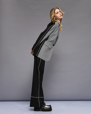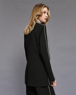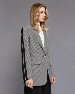 Complete your tailored look with this Black and Houndstooth Blazer, featuring a front pied-de-poule (houndstooth) pattern that matches the Black and White ankle-length pants. The back is solid black, creating a modern contrast, while piping details on the sides add a sleek, structured touch. Designed with a notched lapel collar and front flap pockets, this blazer combines elegance and contemporary style for polished office or formal looks.