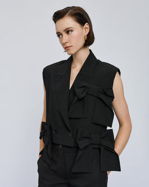 • Make a statement with this Black Gilet, designed with a sleeveless silhouette and elegant bow details at the front and back. Featuring a lapel collar, padded shoulders, and a buttoned closure, it combines structure with feminine charm. Perfect for standout looks, this versatile piece can be layered over shirts, dresses, or tops to elevate any outfit.
