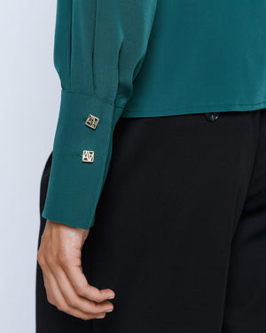 • This Access Fashion wrap blouse is an elegant and versatile piece, designed in a deep forest blue tone that exudes sophistication. Made from a fluid fabric with a soft, slightly lustrous finish, it drapes beautifully over the body and creates a flattering silhouette. The blouse features a deep V-neckline with a wrap-style front that enhances its feminine appeal, while subtle pleating on the shoulders adds a refined touch. Long sleeves with wide cuffs and gold button closures at the back elevate its polished design, making it perfect for both professional and evening looks. Pair it effortlessly with tailored trousers or skirts for a chic and timeless outfit.